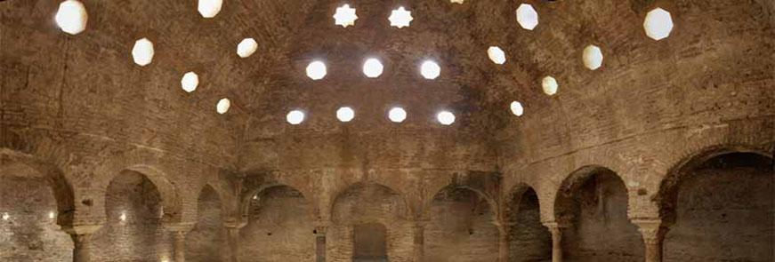 Los árabes heredaron la tradición de las termas romanas de Bizancio y Roma a través de las ciudades del Próximo Oriente y Norte de África, pero redujeron las dimensiones y estandarizaron el tramo de la planta. El concepto de las termas