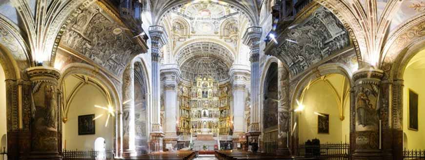 La IGLESIA es de planta basilical: una nave, crucero, capillas laterales y Capilla Mayor. La nave se cubre con bóveda de crucería; la Capilla Mayor con bóveda de medio cañón y tres cascos de esfera; los brazos del crucero con medio cañón y sobre el crucero cimborio sobre trompas aveneradas en las que apean las esculturas de los Evangelistas, y encima bóveda de crucería. Todas estas cubiertas aparecen ricamente decoradas: relieves en casetones en el crucero y Capilla Mayor (obra de Diego de Siloé y sus discípulos); pinturas al fresco en los paramentos y bóveda de la nave (de Juan de Medina).